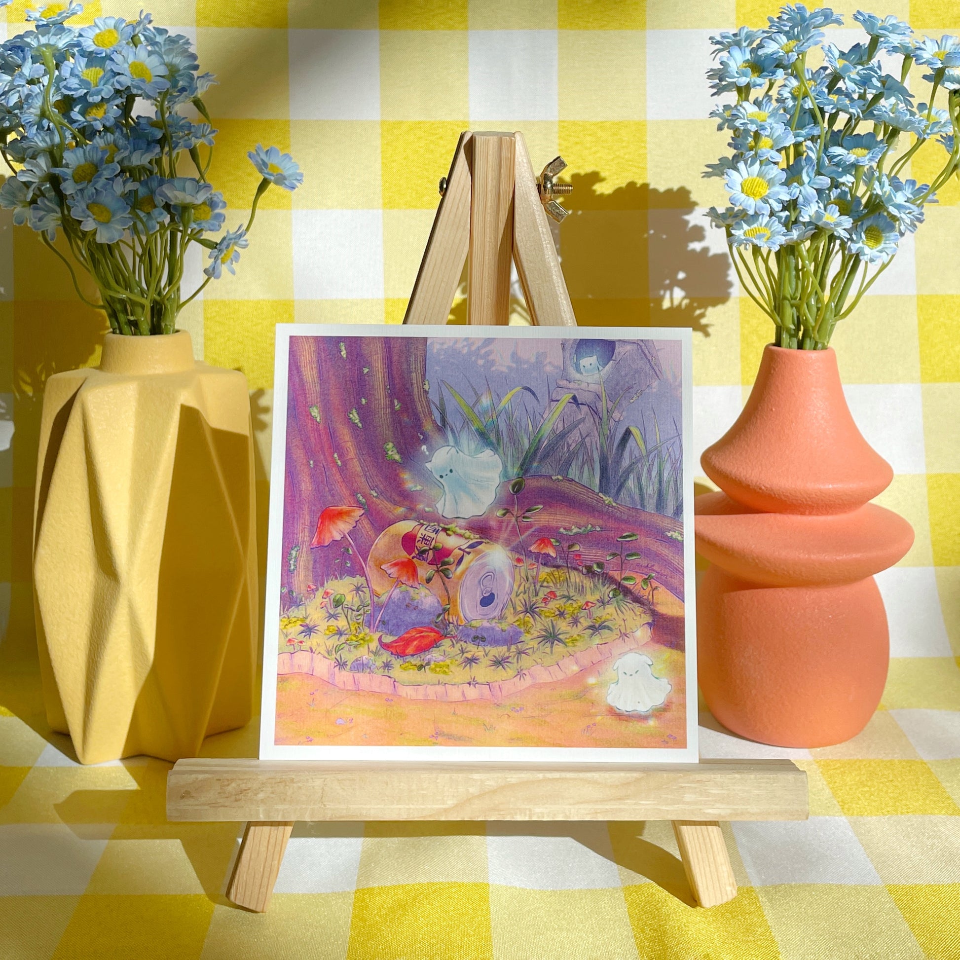 An art print of three curious ghosts exploring the woods and having fun collecting shiny things!